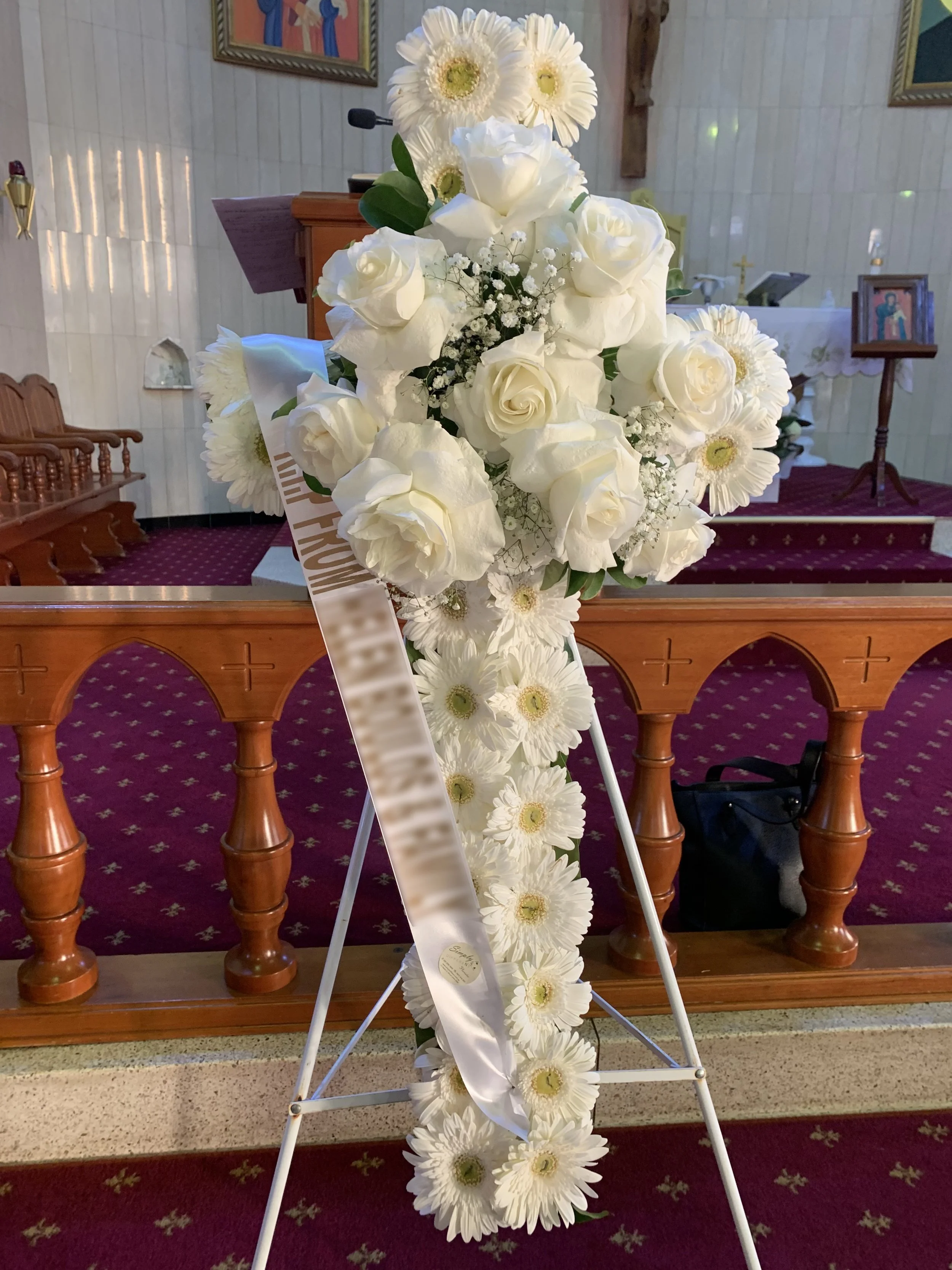 Express your sympathy with this beautifully assembled Funeral Cross. Send love with one of our hand-assembled floral crosses made from seasonal gerbera’s and baby’s breath and a selection of roses. Customise this by choosing your desired colour scheme and leave a personalised greeting card message and ribbon text in the pop-up form.